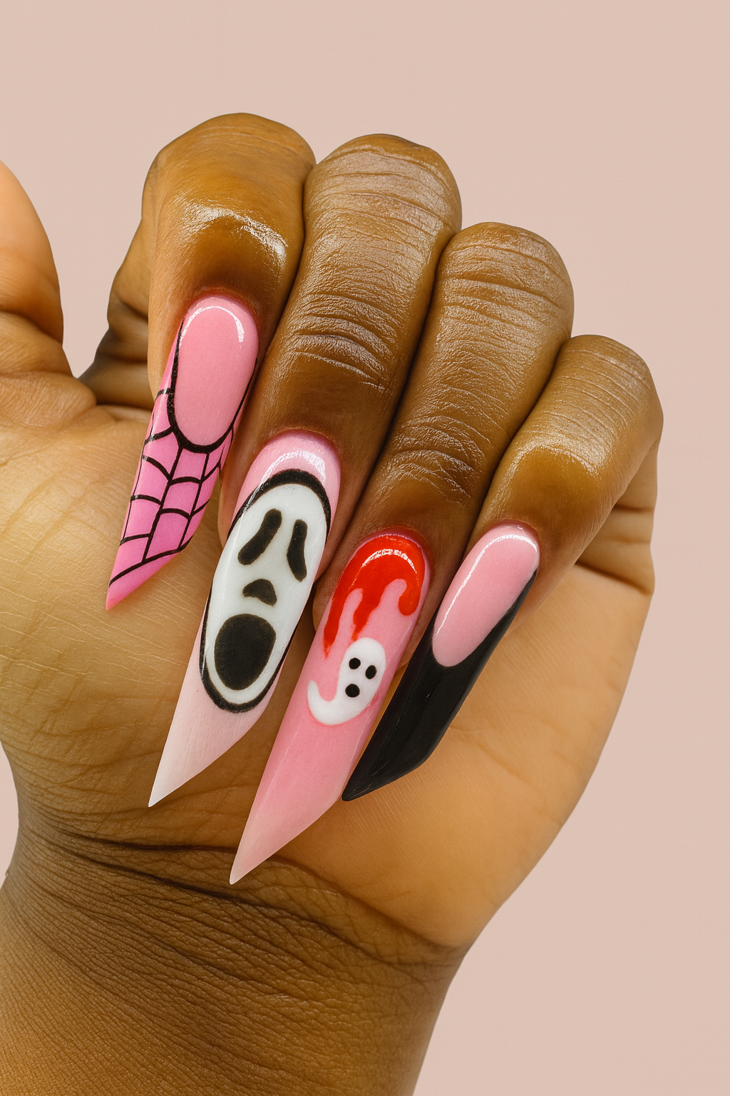 Close-up of a hand with manicured nails featuring pink-to-clear gradient, decorated with rhinestones and glitter.